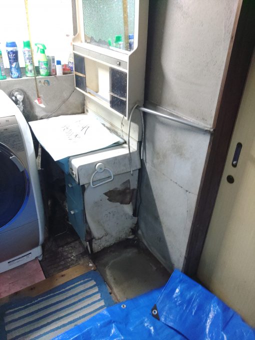 お伺いし、確認させていただきましたところ、洗面台が劣化し排水部の傾きにより水漏れもしており、台の部分が腐って崩れている状況でした。