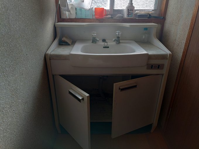 洗面台下の給水管から水が漏れており、収納部の木材がバキバキに割れている状況で、お客様は交換をご希望されておりました。