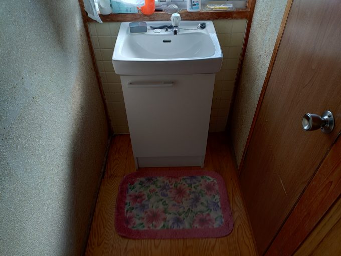お客様は普段住まわれていないらしく、手を洗える程度の洗面台をご希望でしたので、サイズを一回り小さくして施工しました。