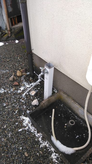 凍結の影響で屋外の水栓柱のなかの給水管が破裂して水漏れしていました。